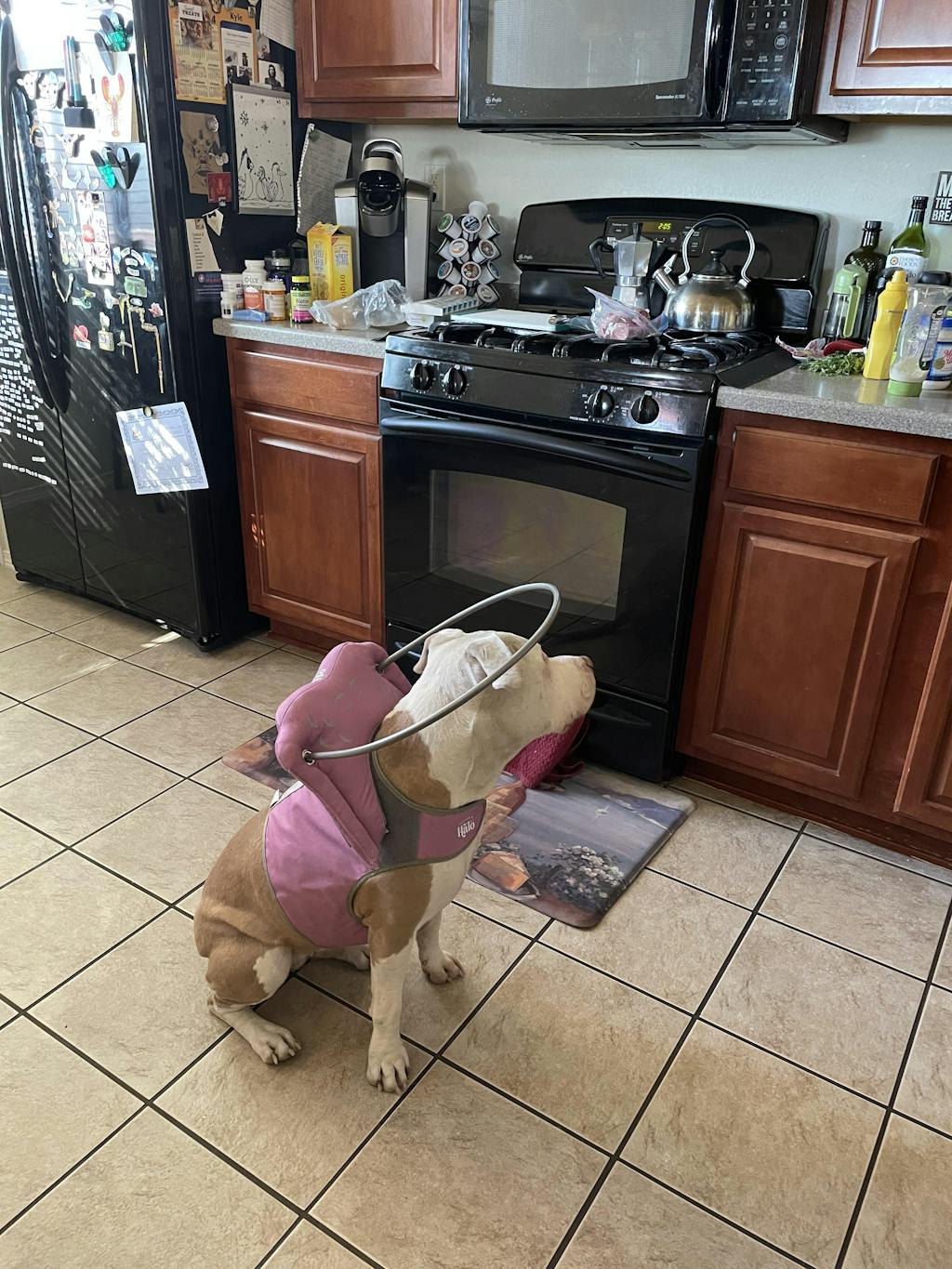Mabel is the sweetest quirky pittie pup that has one heck of a story and most of it is assumption as she was found. She has almost no vision, maybe some shadow light contrast in one eye, but is about it. She’s about 4-6 years old so unknown how long she’s been blind, but we do not believe she was born this way. She is so smart and has learned to navigate beautifully, but at the expensive of her head. This ring has helped her navigate without clocking her noggin on corners and cabinets. It was easy to assemble, soft on her, and that is some industrial Velcro! She is dashing in pink as well. The halo was very well made and stood the test of a hardheaded pittie. Thank you for this wonderful product. If I ever foster another blind pittie, you will be my first stop and I am definitely going to share you guys to my rescue buddies.