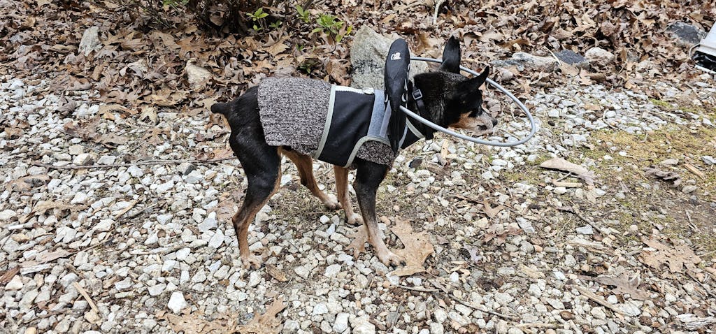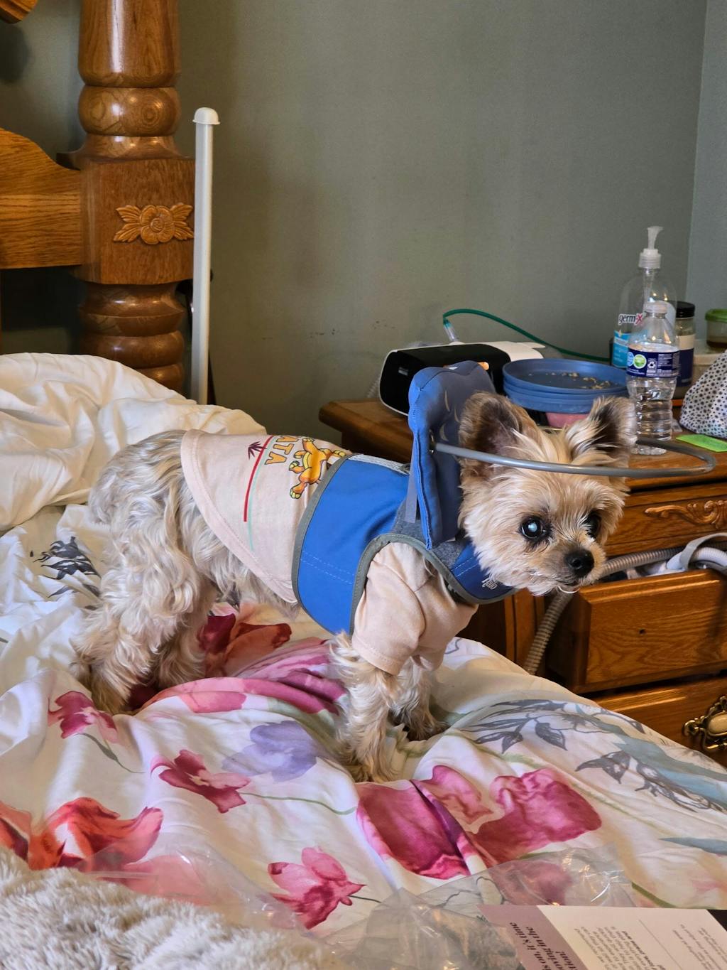 My dog weighs 2.5 lbs. He's a 15-year-old Rusky Toy. Unsurprisingly, I had to make a few adjustments because even the smallest size was a bit too big. I secure the hoop with zip ties directly onto the sides of the harness. My dog now moves with much more confidence. It took him about three days to get the hang of it.