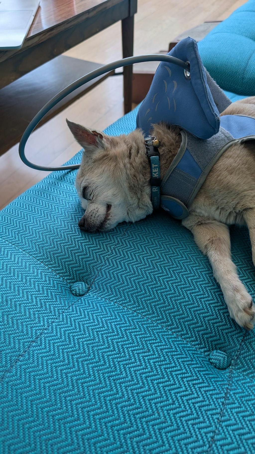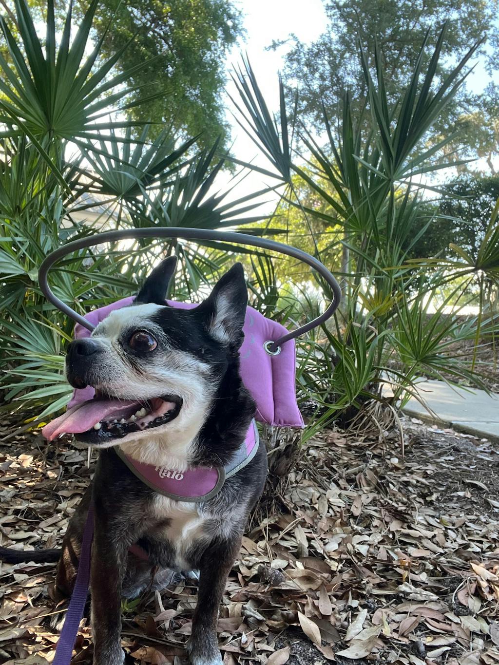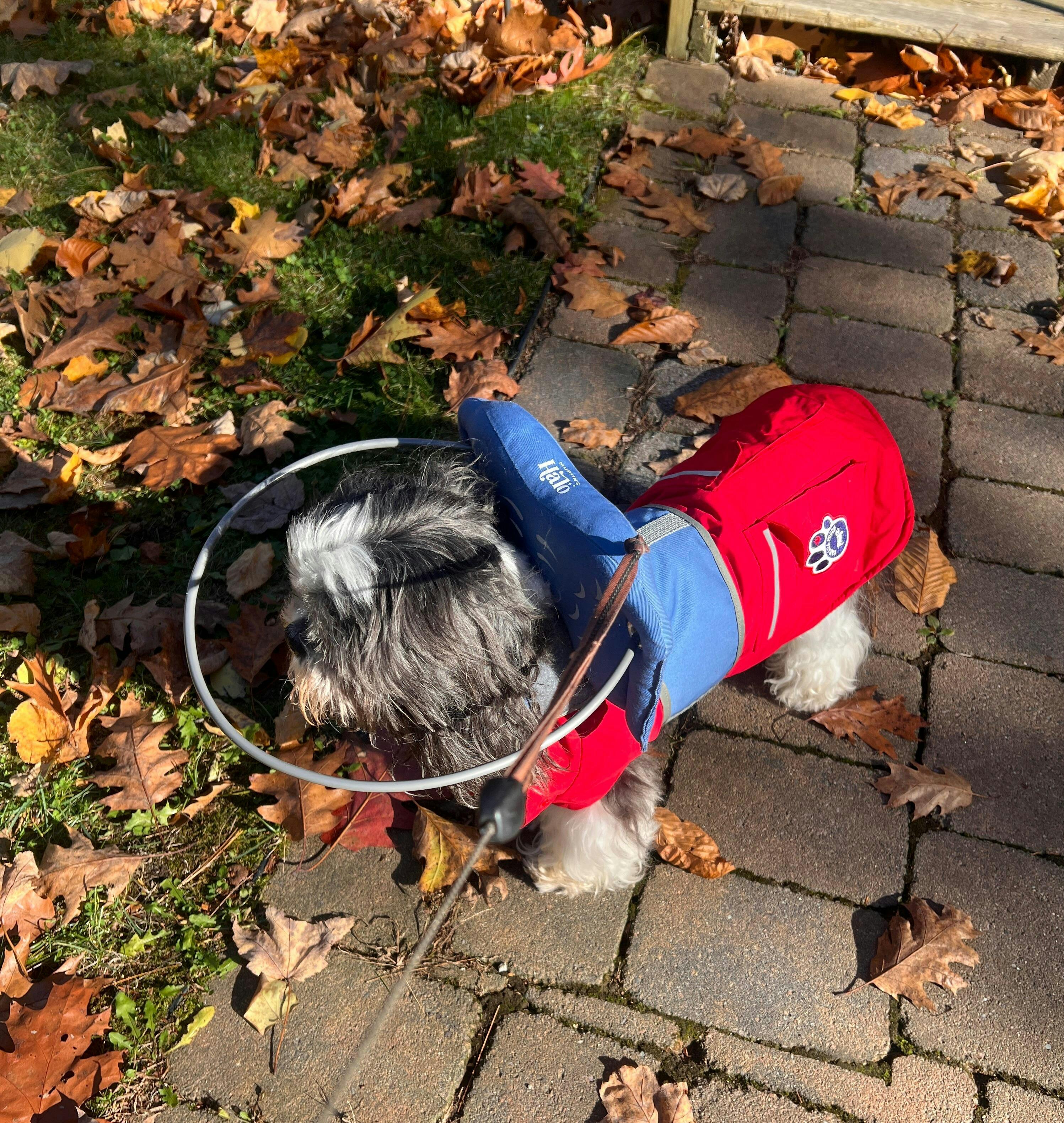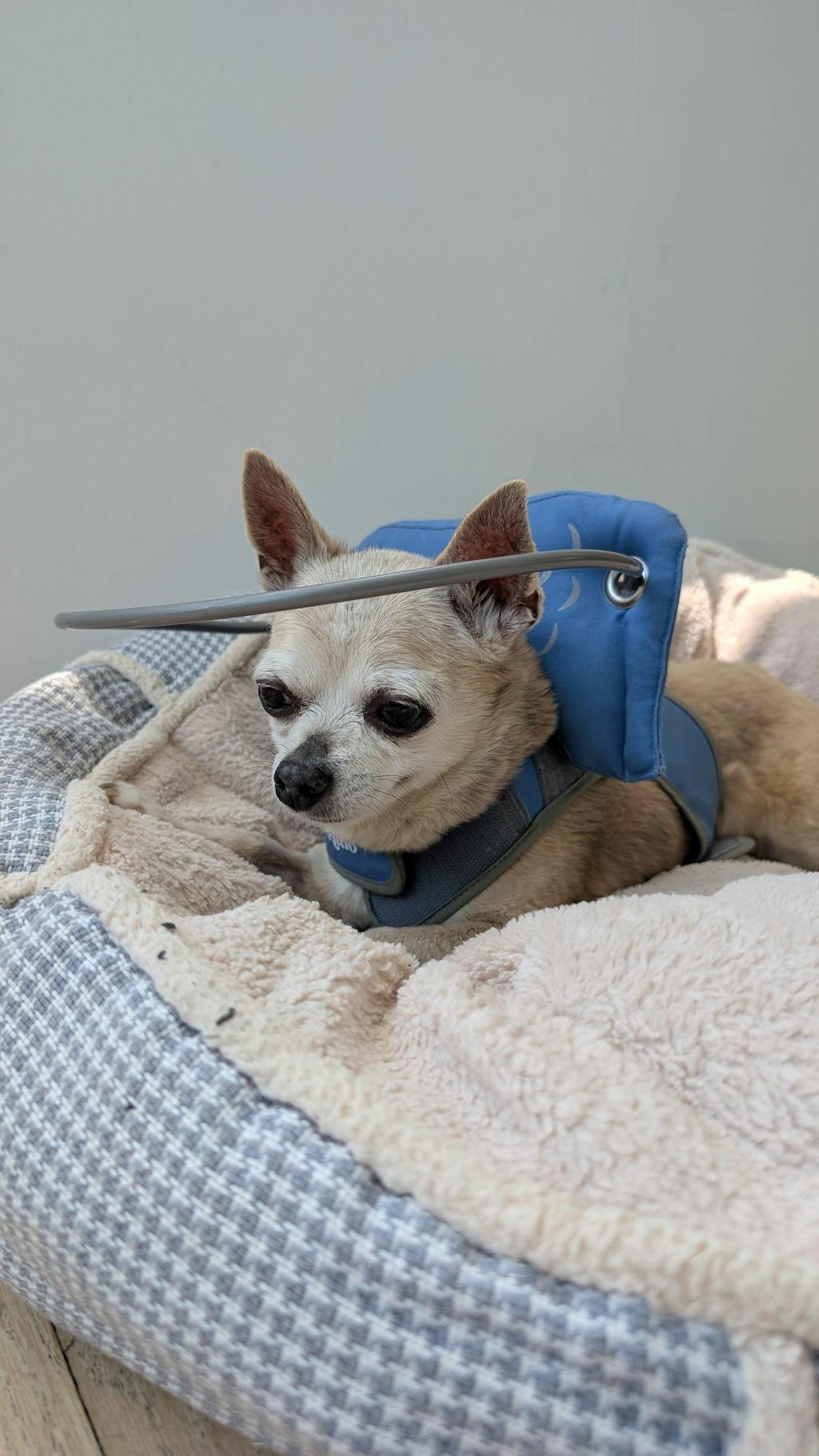 Our sweet 9 year old Frenchie Daphne finally lost the battle with glaucoma in May 2025 losing vision in her remaining eye before enucleation. While she was spending a month long recovery in a cone, we knew we needed to figure something out for long-term safety and comfort. The cone did not go well with verbal cues due to sound distortion. She has now been wearing her halo for about 7 weeks and is doing tremendously well. It gives her the confidence to navigate her new world better and gives us peace of mind since we are both working adults where she is left unattended by humans for several hours during the day. The structure of the three-piece set is far superior to any alternative we had purchased and considered. The clear winner was Muffin’s Halo, and we came back to purchase another two colors! It is sturdy, comfortable, and clearly made of quality materials. Rest assured that customer support is amazing as well. We were accidentally shipped an incorrect size and support was extremely quick to respond and send out a replacement for exchange. It’s important to note that their normal return policy doesn’t permit for refunds or exchanges so be mindful of triple measuring your pets.