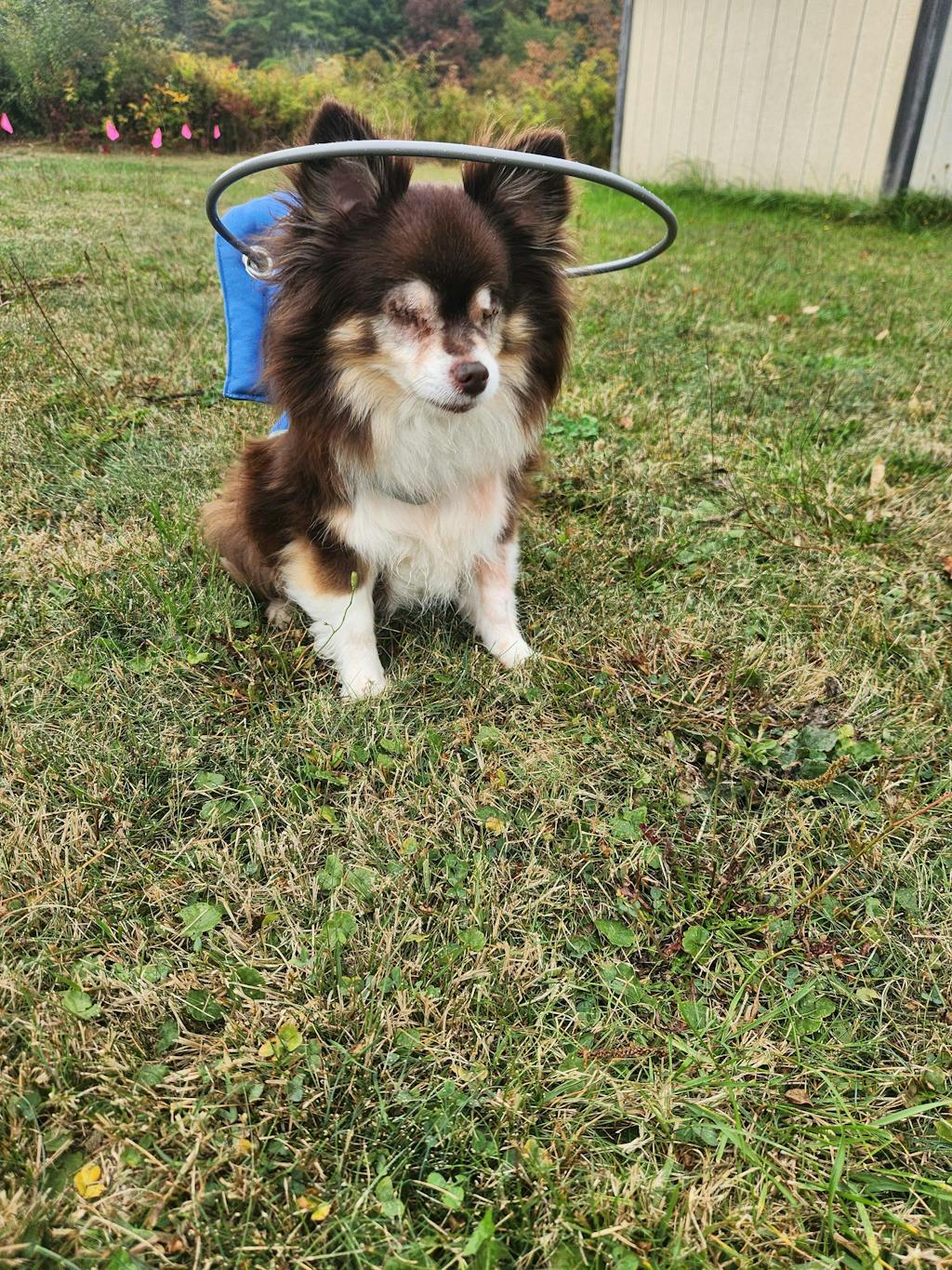 A few years ago a dog we had went blind from diabetes. He was so worried about hurting himself he wouldn't do anything but lay around all day. I searched online for a solution and found Muffin's Halo. It gave him a second life. He was unstoppable! A couple months ago another dog of ours has gone blind from diabetes. But this time I knew exactly what to do when he stopped taking an interest in things. I got online and ordered him his very own halo. Now he cruises around and banks that hoops into everything. He's fearless and indestructible. Thank you Muffin's Halo for giving our beloved pets the chance they need to live out their lives happy and mobile!