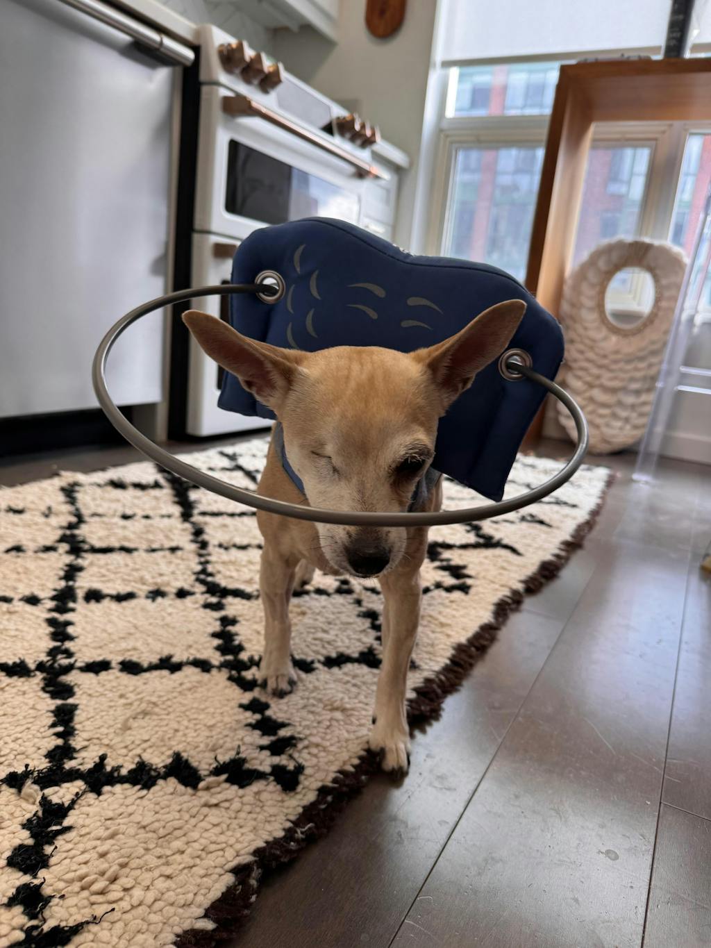 Your dog will be using other senses to explore the world around them, so let them sniff the harness and wings before putting them on. Once you have Muffin’s Halo on, we recommend placing your blind dog near a corner or wall so they can softly bump into a hard surface to experience being redirected with their Halo. They will quickly learn that the purpose of the halo is to help them navigate. Make sure this, as with everything else, is a positive experience - lots of love, praise and treats will help!